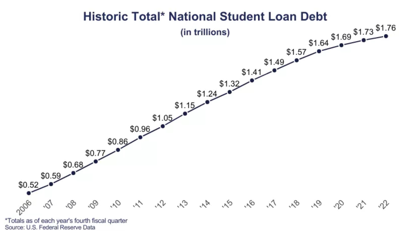 Over the last few decades, the cost of a college education has steadily increased. Tuition at a public four-year college went from around $4,000 to nearly $11,000. At private institutions, we’re looking at numbers closer to $19,000 and $39,000. In the United States, we have $1.75 trillion total in student loan debt. That is astronomical.